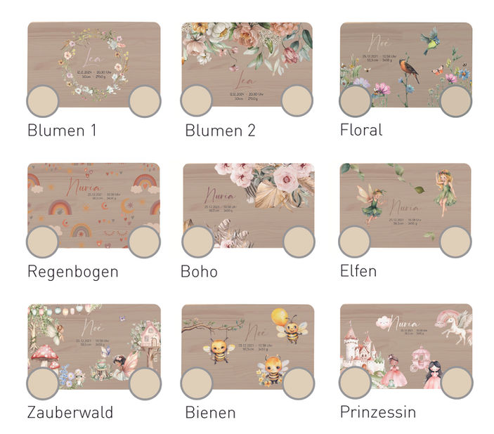 In den Slideshows unten siehst du, wie die Sujets auf den verschiedenen Produkten dargestellt sind (z. B. Tritthocker, Spielzeugwagen, Messlatte).